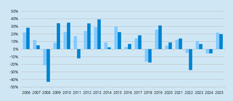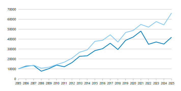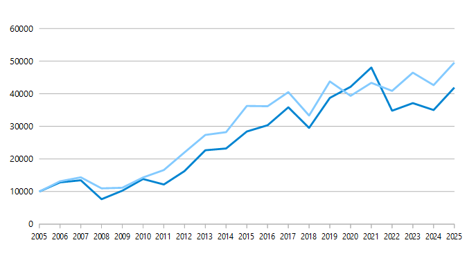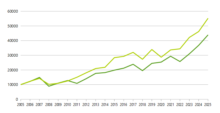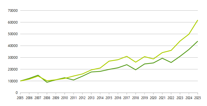 Im Folgenden soll nun geprüft werden, wie sich die beiden Strategien in den letzten 20 Jahren sowohl im DAX als auch im MDAX geschlagen hätten. Wir untersuchen dabei in beiden Fällen, wie sich ein Anfangsinvestment von 10.000€, das nach den oben beschriebenen Strategien angelegt worden wäre, entwickelt hätte. Der Beobachtungszeitraum beginnt am ersten Handelstag des Jahres 2005 und endet am letzten Handelstag des Jahres 2025.